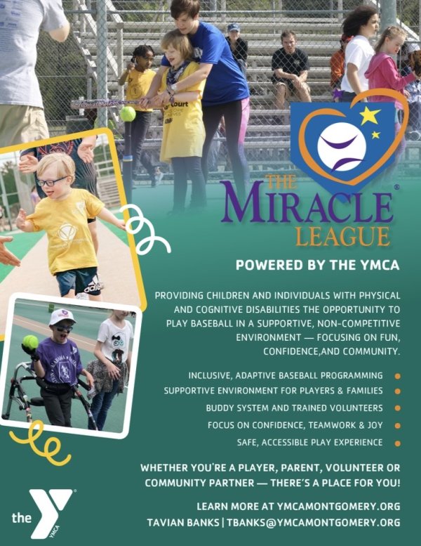 The Miracle League is designed to promote the physical, mental, and emotional growth of Individuals with special needs through baseball. For athletes ages 3 to 65+ with intellectual, emotional, or physical disabilities. The program provides an inclusive, supportive, and safe environment experience at no cost to families. Each athlete is paired with a volunteer “buddy” who aids on and off the field, ensuring every participant can fully engage in the game. The program will play and practice at Edward Thompson Park in Montgomery, Alabama. Reach out to Tavian Banks, tbanks@ymcamontgomery.org for more information.